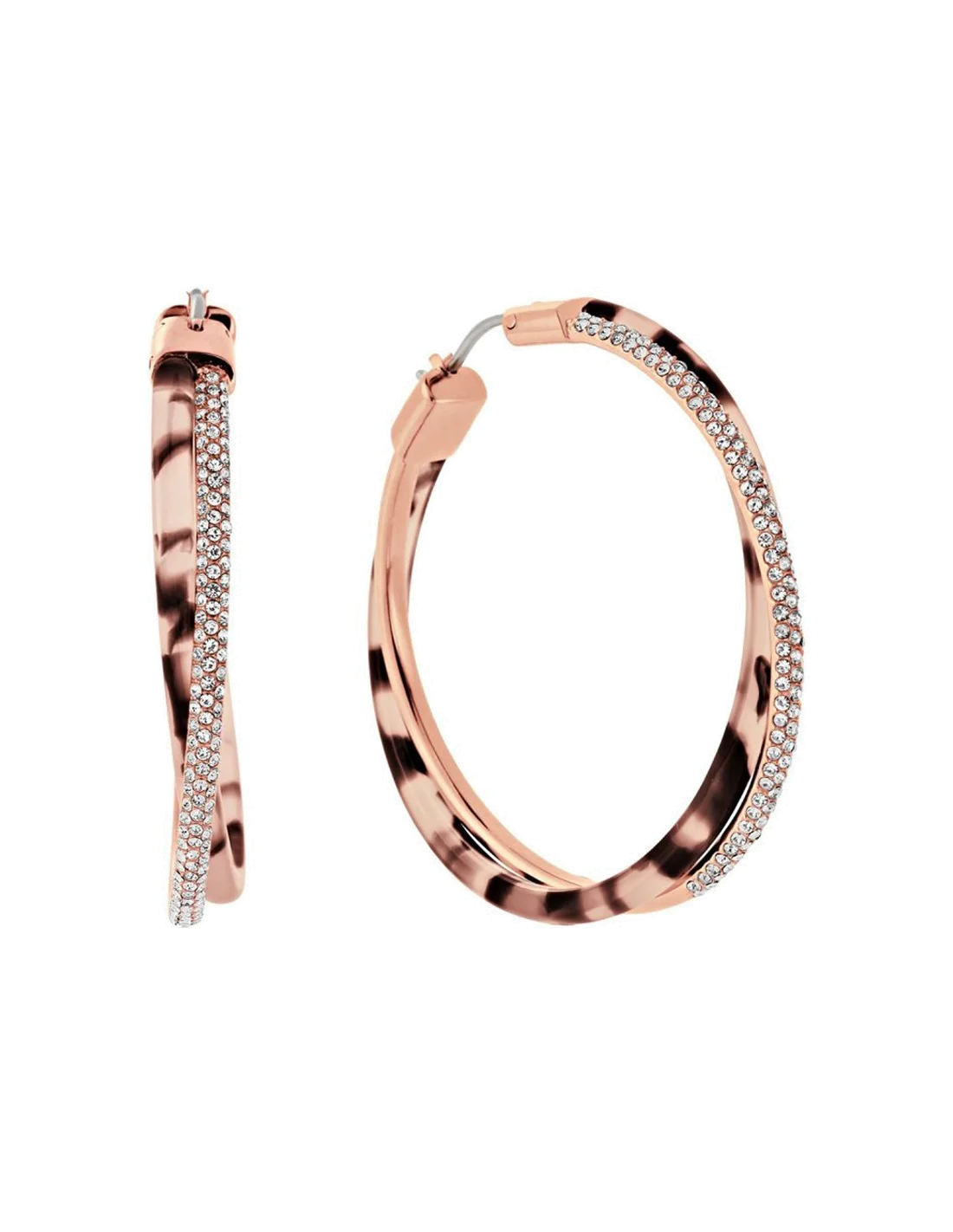 L'élément signature réside dans la fine bande de strass qui sépare ces deux univers. Cette ligne de lumière, composée de cristaux taillés avec précision, vient souligner la courbe de la créole d'un scintillement vif à chaque mouvement. Le contraste entre le chaud de l'or rose, la richesse du marron écaille et l'éclat froid des strass crée une pièce à la fois audacieuse et sophistiquée. Le fermoir à clip, robuste et discret, assure un port sécurisé et confortable toute la journée.