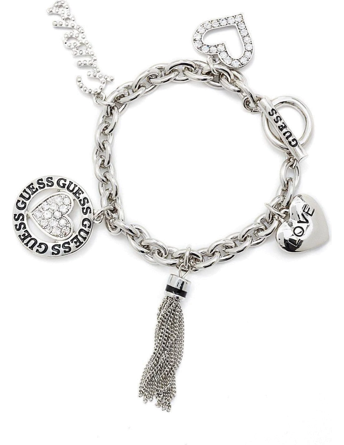 - Détail des breloques : 3 breloques en forme de cœur, 2 breloques avec inscription "Guess"