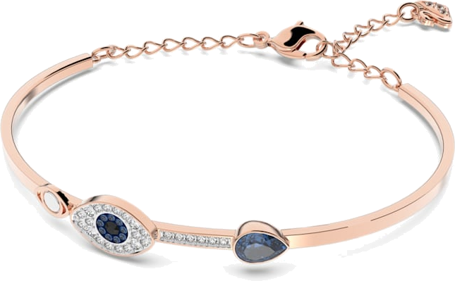 Ce bracelet-jonc Swarovski présente un mélange de finitions et de matières créant un contraste visuel saisissant. La structure en métal plaqué or rose sert d'écrin à des cristaux sertis en pavé, rehaussés par des accents d'un bleu profond.