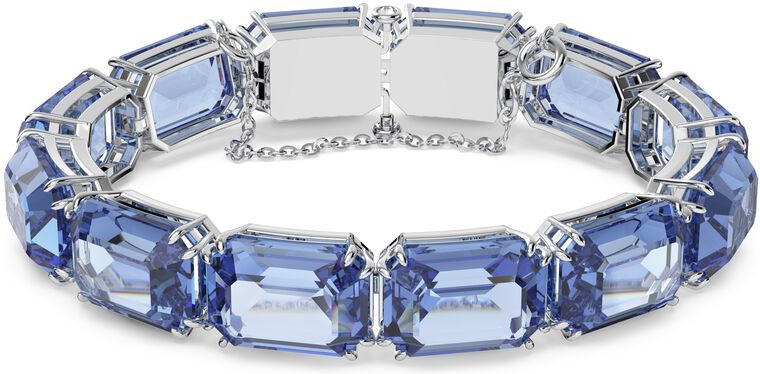 La monture de ce bracelet est intégralement en métal plaqué rhodium. Ce finissage argenté, froid et durable, offre un contraste sophistiqué qui exalte l'intensité du bleu des cristaux. La fermeture est assurée par un fermoir crochet dissimulé de type W, accompagné d'une chaînette de sécurité à levier pour un port en toute sérénité. La longueur est ajustable pour un confort optimal au poignet.