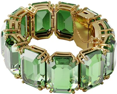 Le bracelet Millenia se distingue par un jeu de lumière et de texture singulier. Chaque cristal, taillé en une forme octogonale profonde, agit comme un prisme capturant la lumière. Le vert intense, à la fois profond et vibrante, contraste avec la chaleur du placage or qui l'enserre, créant une palette précieuse. En le manipulant, on perçoit la régularité impeccable du sertissage, chaque pierre solidement ancrée dans sa monture, offrant une surface lisse et agréable au contact de la peau.