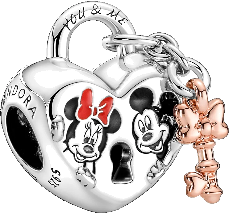 Pour vous ou l’un de votre proche, ce Charm femme Pandora - 780109C01 fait toujours autant plaisir. Ce cadenas en forme de cœur bombé est orné de Minnie et de Mickey avec une serrure au centre. La clé en métal doré à l'or rose fin 585/1000 scintille sur le côté pour un effet très glamour.