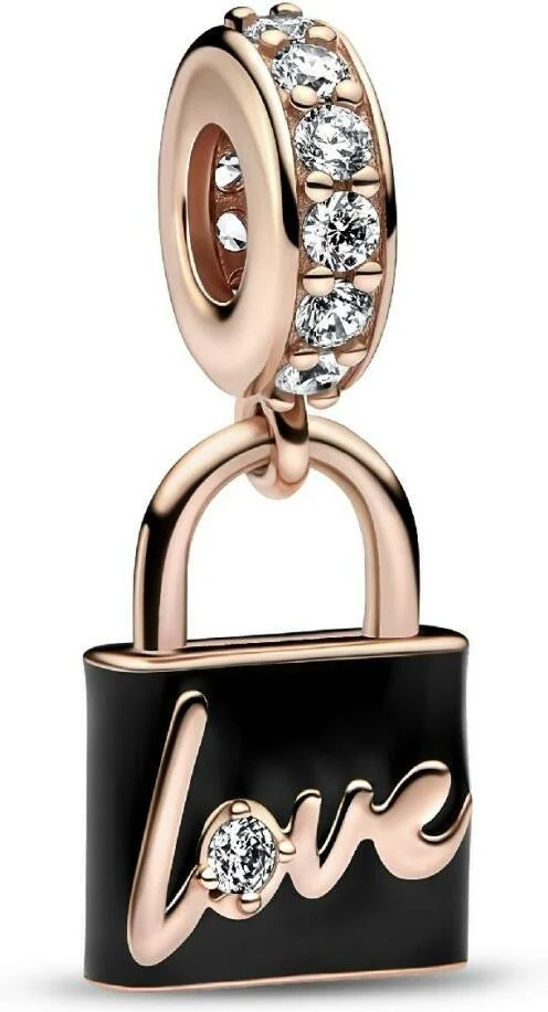 Ce charm Pandora se distingue par sa construction en or rose 14 carats (585/1000), un alliage qui confère une chaleur dorée subtile et une résistance exceptionnelle au quotidien. Le métal est travaillé avec une finition bicolore, où l'or rose dialogue élégamment avec des accents dorés, créant un jeu de lumière raffiné au moindre mouvement. La pièce maîtresse, un cadenas miniature, présente une surface noire profonde qui offre un contraste saisissant et moderne, mettant en valeur la densité et le poli impeccable du métal précieux.