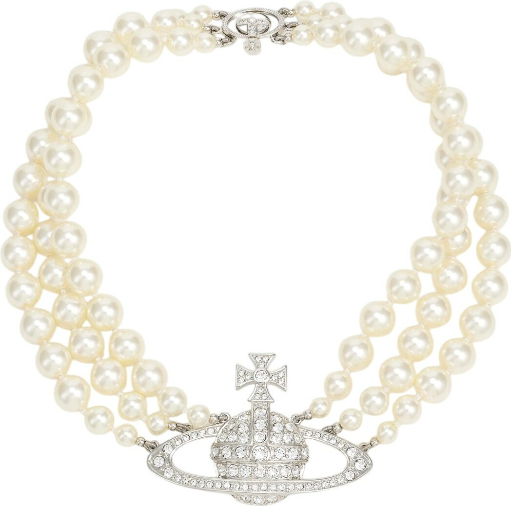 Découvrez le collier choker Vivienne Westwood Bas Relief Three Row, référence VW951L056-D11, une pièce emblématique qui capture l'essence de l'audace et de l'élégance vintage de la marque. Ce bijou pour femme, réalisé en laiton, se distingue par sa construction en trois rangs de perles synthétiques d'un éclat remarquable, offrant une texture riche et une présence visuelle sophistiquée au ras du cou.