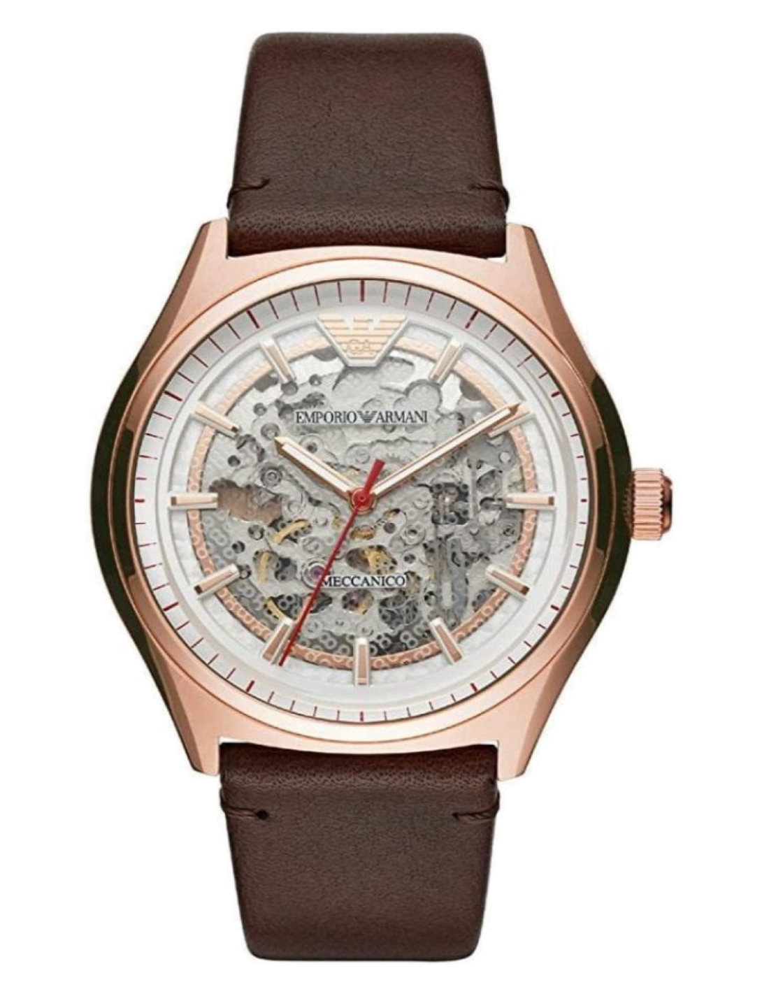 Montre Homme Emporio Armani Zeta AR60005 Automatique Squelette - Cadran Argent, Boîtier Or Rose, Bracelet Cuir Marron
