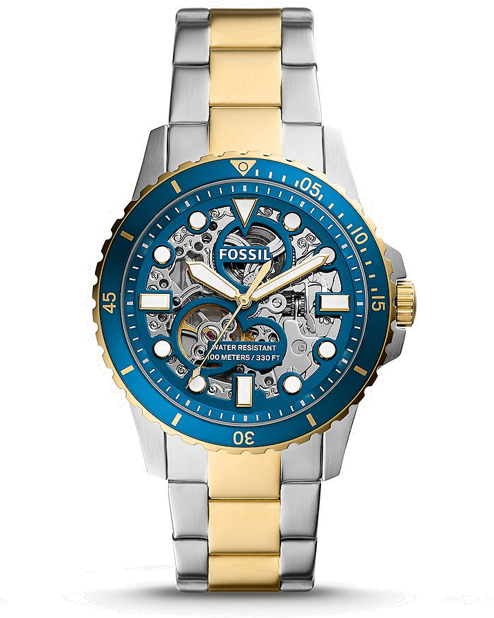 Montre Homme Fossil FB-01 Automatique ME3191 - Boîtier Acier Bicolore Argent/Or, Cadran Bleu Squelette