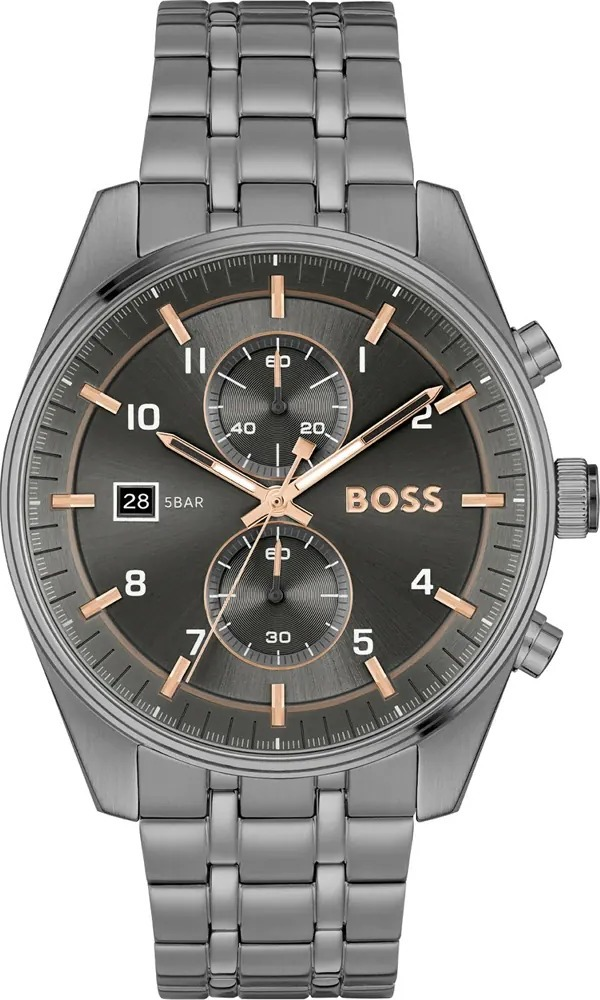 La montre Hugo Boss Skytraveller 1514153 se distingue par son boîtier en acier inoxydable gris à finition mate. Cette texture technique et sobre offre une résistance accrue aux micro-rayures et ne conserve pas les traces de doigts. Avec son cadran de 44 mm, elle affirme une présence masculine équilibrée et confortable au poignet.