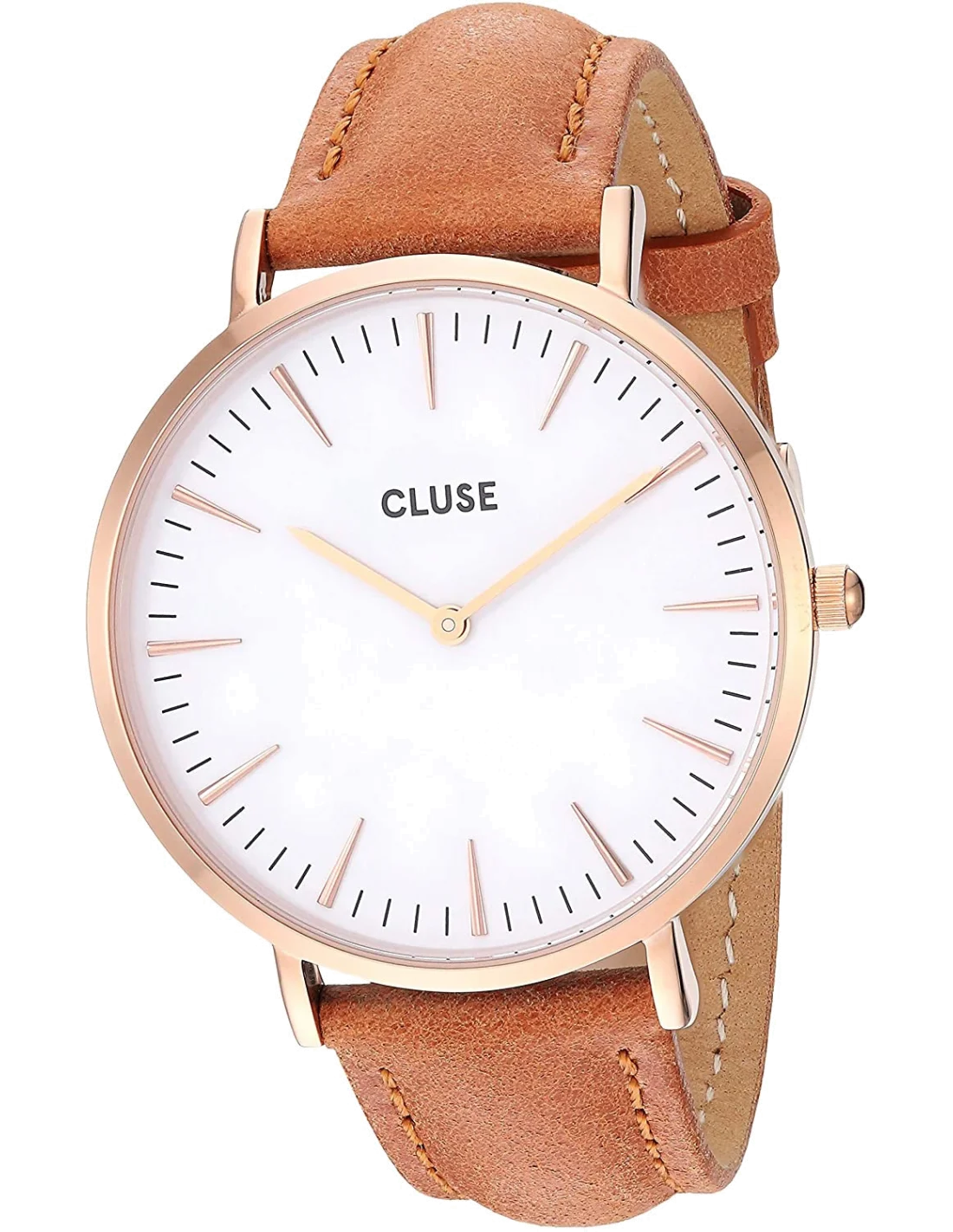 La montre Cluse La Bohème CL18011 est une pièce qui séduit par son équilibre et sa discrète élégance. Dès la première prise en main, on est frappé par la finesse remarquable de son boîtier, une épaisseur de seulement 7 mm qui lui confère une silhouette légère et contemporaine. Le mariage des matières est un exercice de style réussi : la chaleur de l’or rose du boîtier contraste avec la sérénité d’un cadran blanc coquille d’œuf, tandis que le cuir brun du bracelet apporte une note naturelle et authentique. Chaque détail, des index bâtons aux aiguilles fines, est exécuté avec une précision qui témoigne d’un savoir-faire attentif.