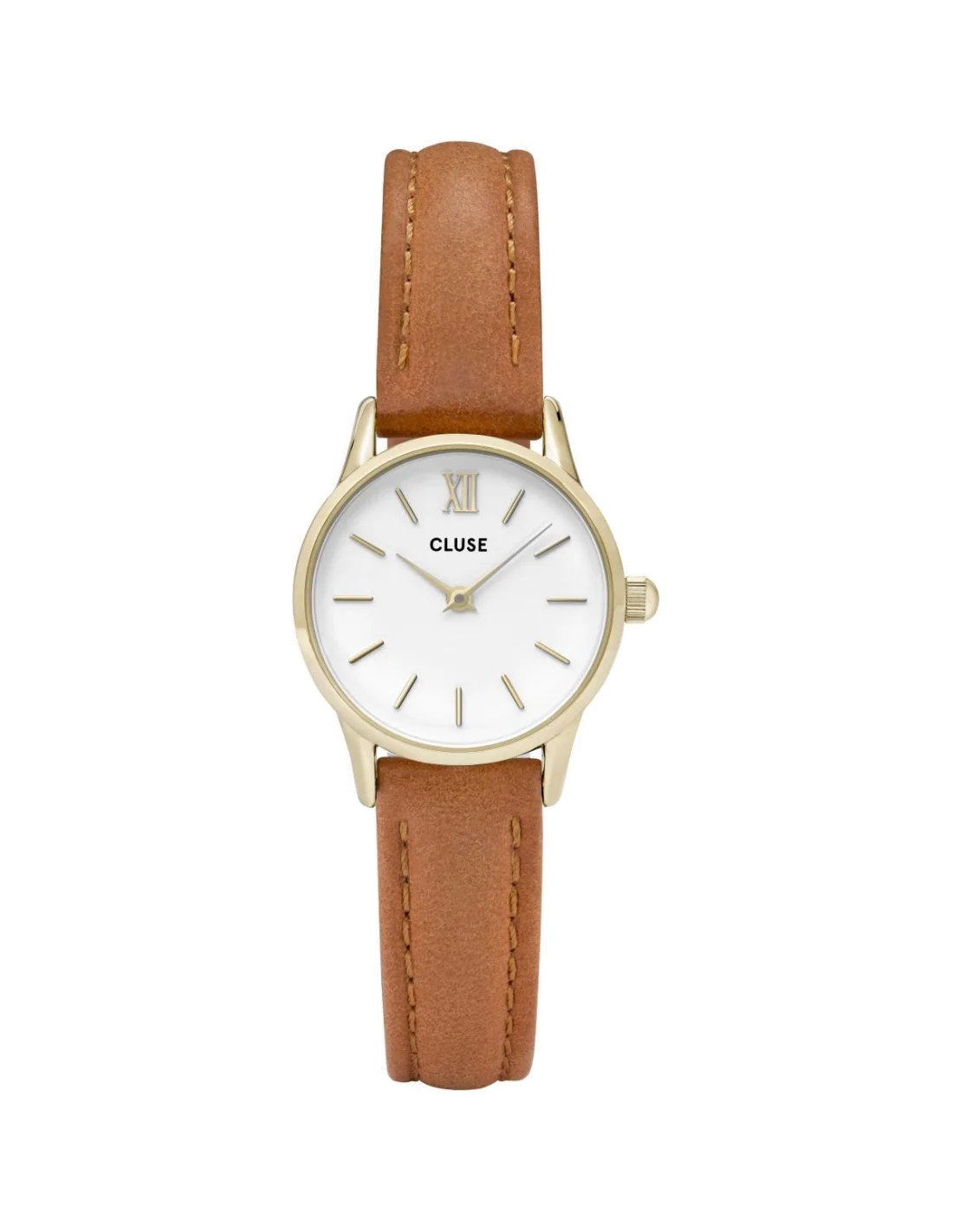 Le boîtier, d'un diamètre de 24 mm, se distingue par ses proportions délicates et parfaitement équilibrées. Son fini doré, appliqué sur de l'acier inoxydable, offre un éclat chaleureux et raffiné, sans ostentation. Il encadre un cadran d'une blancheur immaculée, servant d'écrin à des index et des aiguilles fines et élancées. La lecture de l'heure devient un instant de pureté visuelle, où la simplicité du design révèle toute son élégance. L'ensemble dégage une harmonie sensorielle où le chaleureux du cuir répond à la fraîche luminosité du cadran et à la touche précieuse du boîtier.