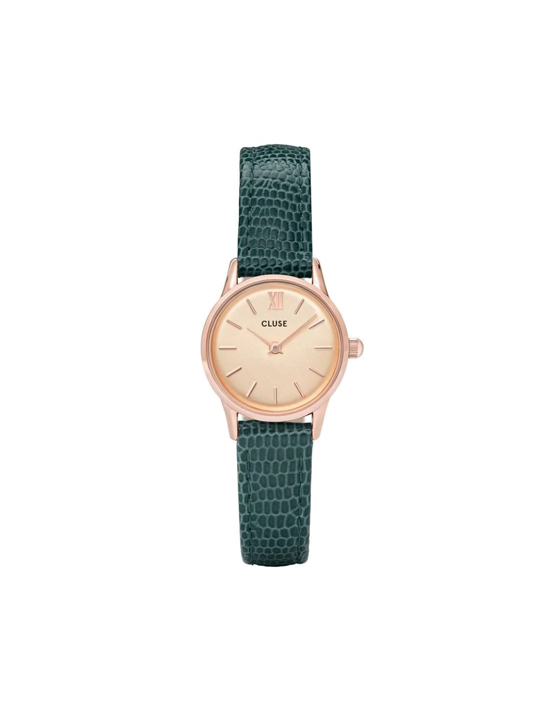 La montre Cluse La Vedette CL50029 est un exercice d'équilibre chromatique réussi. Le vert profond et satiné du bracelet en cuir véritable évoque la richesse d'une forêt à l'ombre, apportant une touche de caractère et de fraîcheur. Ce vert dialogue avec la douceur du boîtier en acier inoxydable finition or rose, dont la teinte chaude et contemporaine enveloppe le poignet d'une lueur discrète. L'ensemble crée une harmonie à la fois naturelle et sophistiquée, loin des contrastes trop marqués.