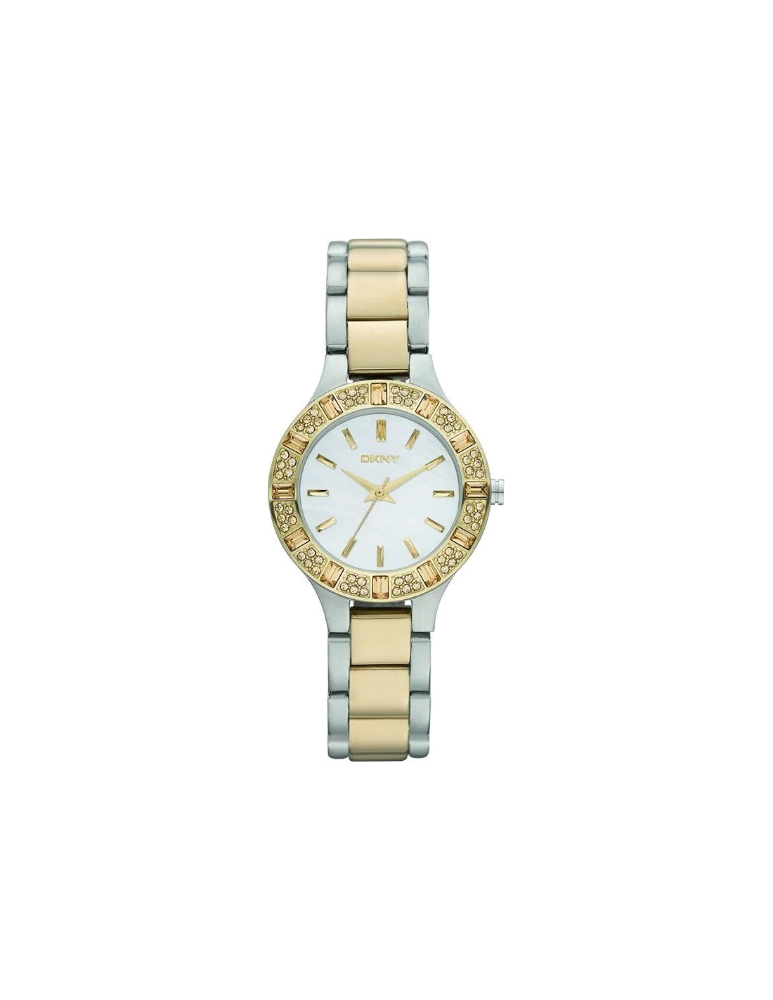 La montre DKNY NY8742 dispose d'une lunette incrustée de strass de différentes formes. Elle est assortie au bracelet en acier doré et argenté.