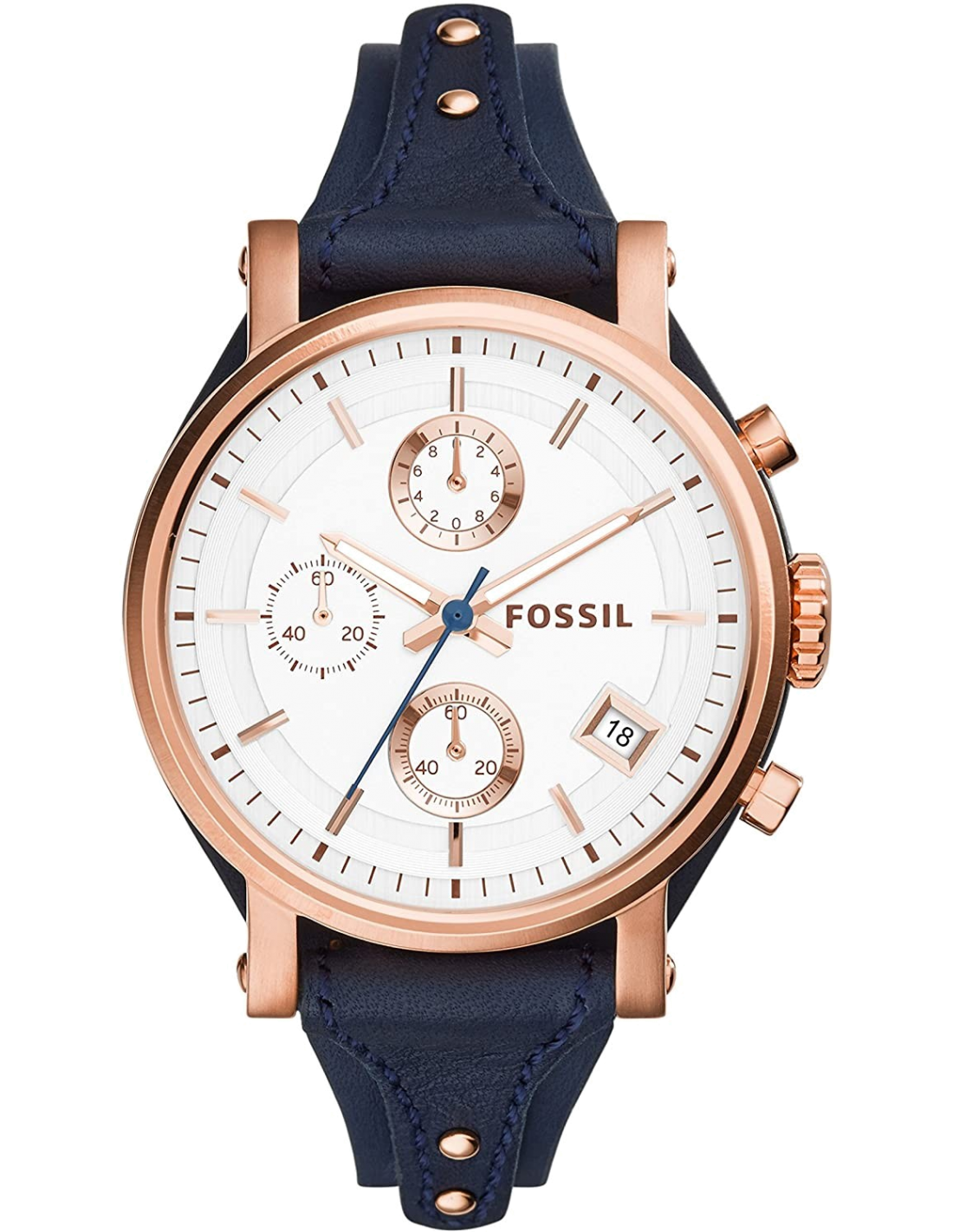 Montre Femme Fossil Original Boyfriend ES3838, boîtier or rose et bracelet cuir bleu