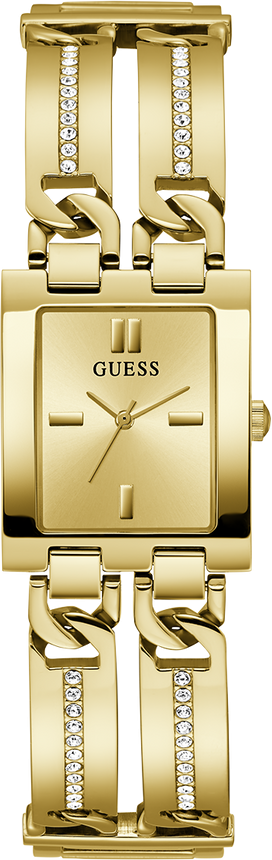 La montre Guess GW0668L2 affirme un style personnel fort avec son boîtier carré en acier doré. Cette forme géométrique moderne structure le poignet et allonge visuellement la silhouette, rompant avec les codes traditionnels du cadran rond. La finition dorée, profonde et chaude, capture la lumière pour des reflets changeants, tandis que les cristaux intégrés aux maillons centraux apportent une touche de fantaisie lumineuse sans surcharge.