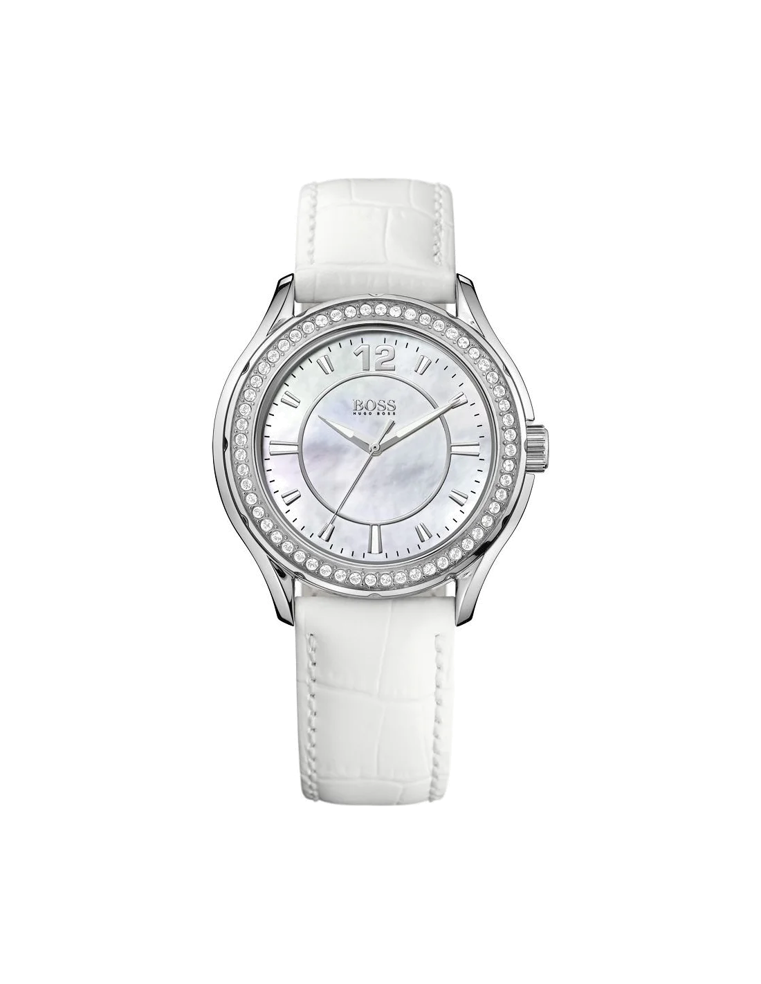 Cette montre Hugo Boss de couleur Blanc avec son bracler en Cuir pour Femme dispose d'un cadran de 40mm.