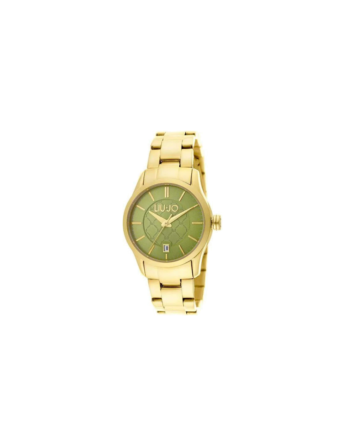 Ce cadran de couleur verte est joliment assorti à un bracelet acier doré.