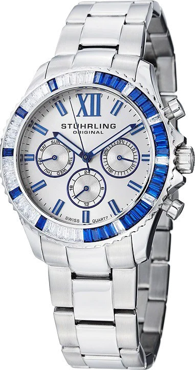 La montre 591.01 en acier argenté de Stuhrling est féminisée par une lunette tournante ornée de pierres.