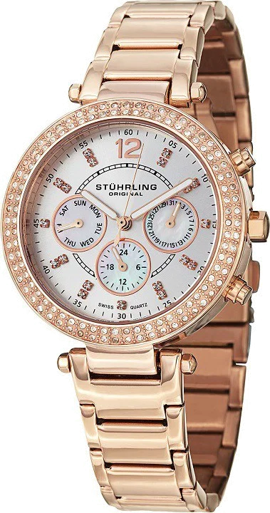 La montre Stuhrling 888.03 est en acier inoxydable dans les tons or rose.