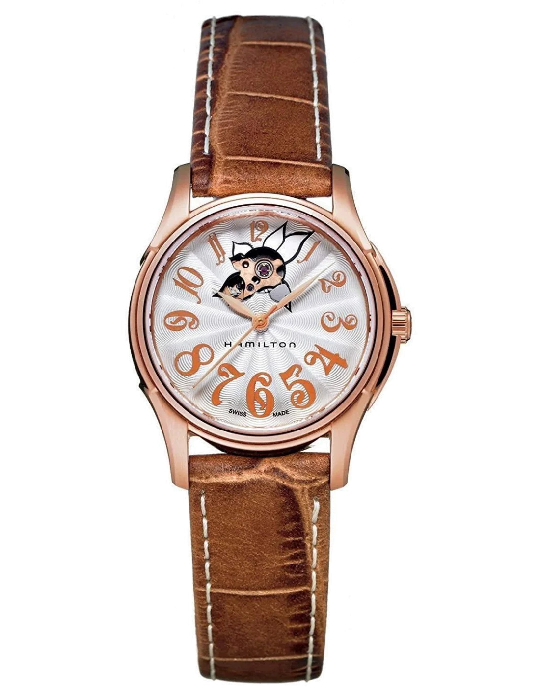 Montre Hamilton H32345983 Jazzmaster Lady automatique acier PVD or rose sur cuir marron 34 mm