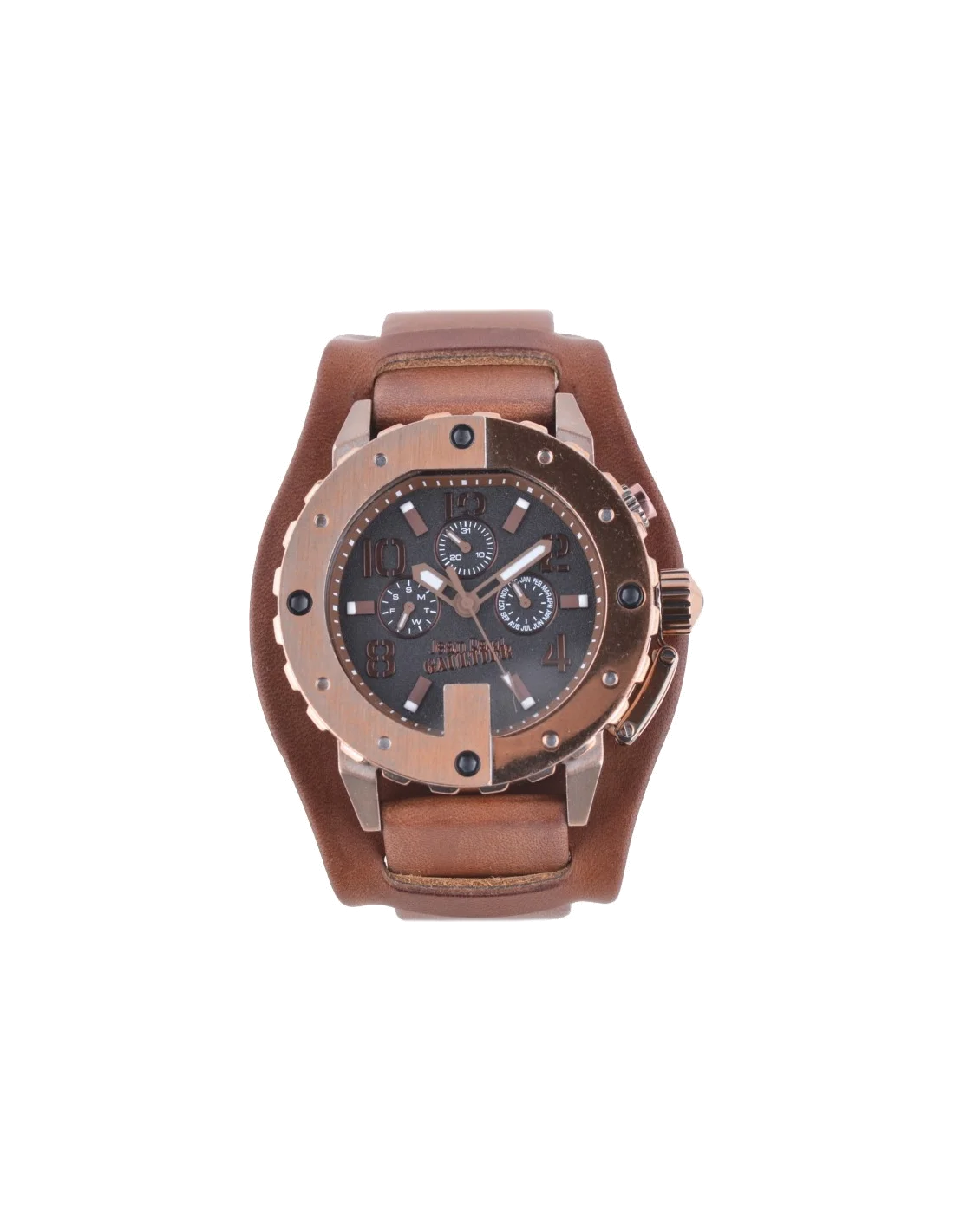 Cette montre lancée par le célèbre couturier Jean Paul Gaultier se veut racée avec sa lunette crantée et sertie de clous, son cadran à 3 compteurs et son large bracelet marron en cuir.