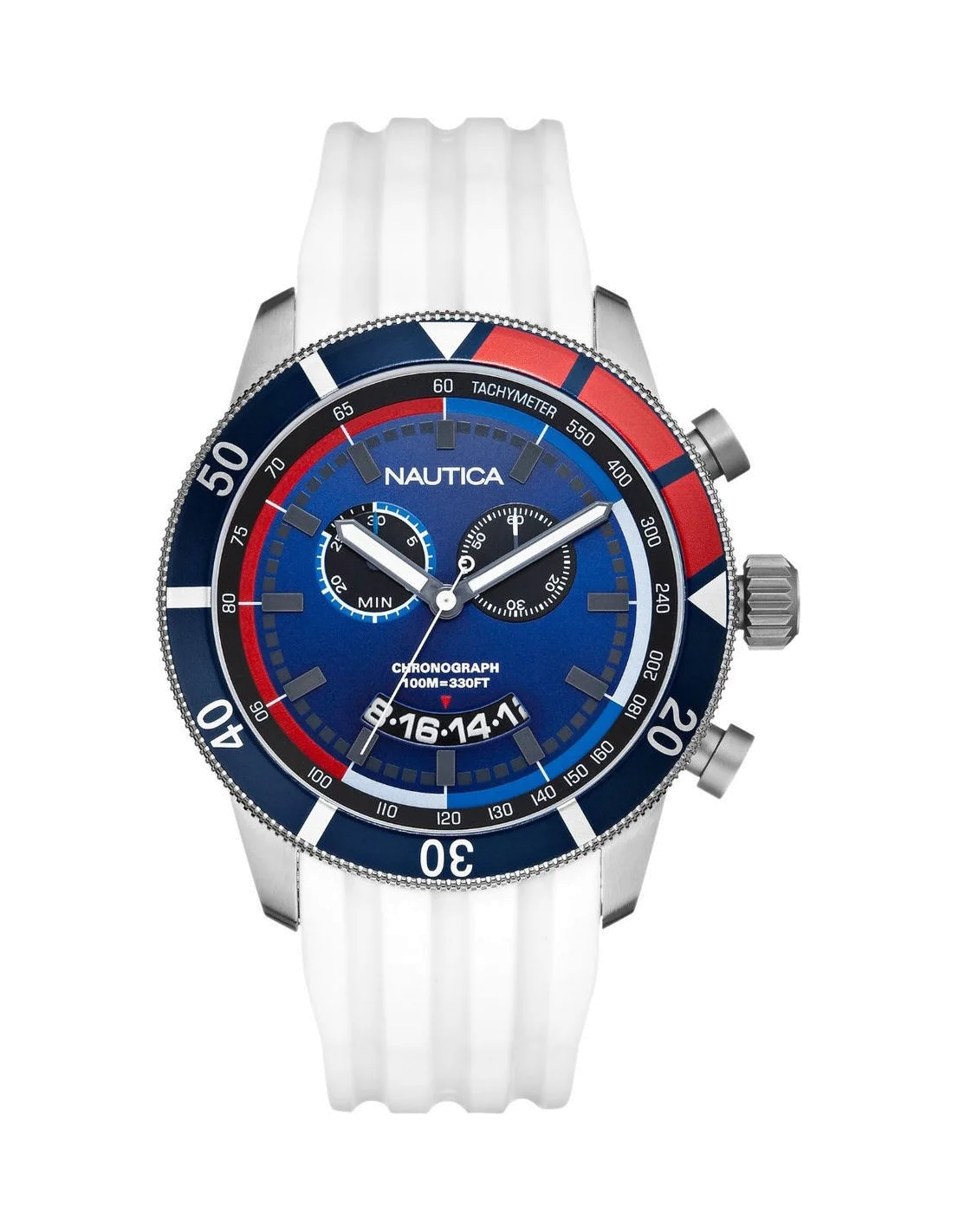 La Nautica NSR 08 A17585G impose immédiatement son caractère nautique et sportif. Dès le premier regard, on est séduit par le jeu de contrastes entre son bracelet en résine d'un blanc immaculé et les éclats de bleu et de rouge qui animent le cadran et la lunette unidirectionnelle. Ces touches de couleur ne sont pas de simples détails décoratifs ; elles structurent l'affichage, guidant l'œil avec une parfaite lisibilité vers les index et les aiguilles, rehaussés d'un traitement lumineux pour une lecture dans toutes les conditions.