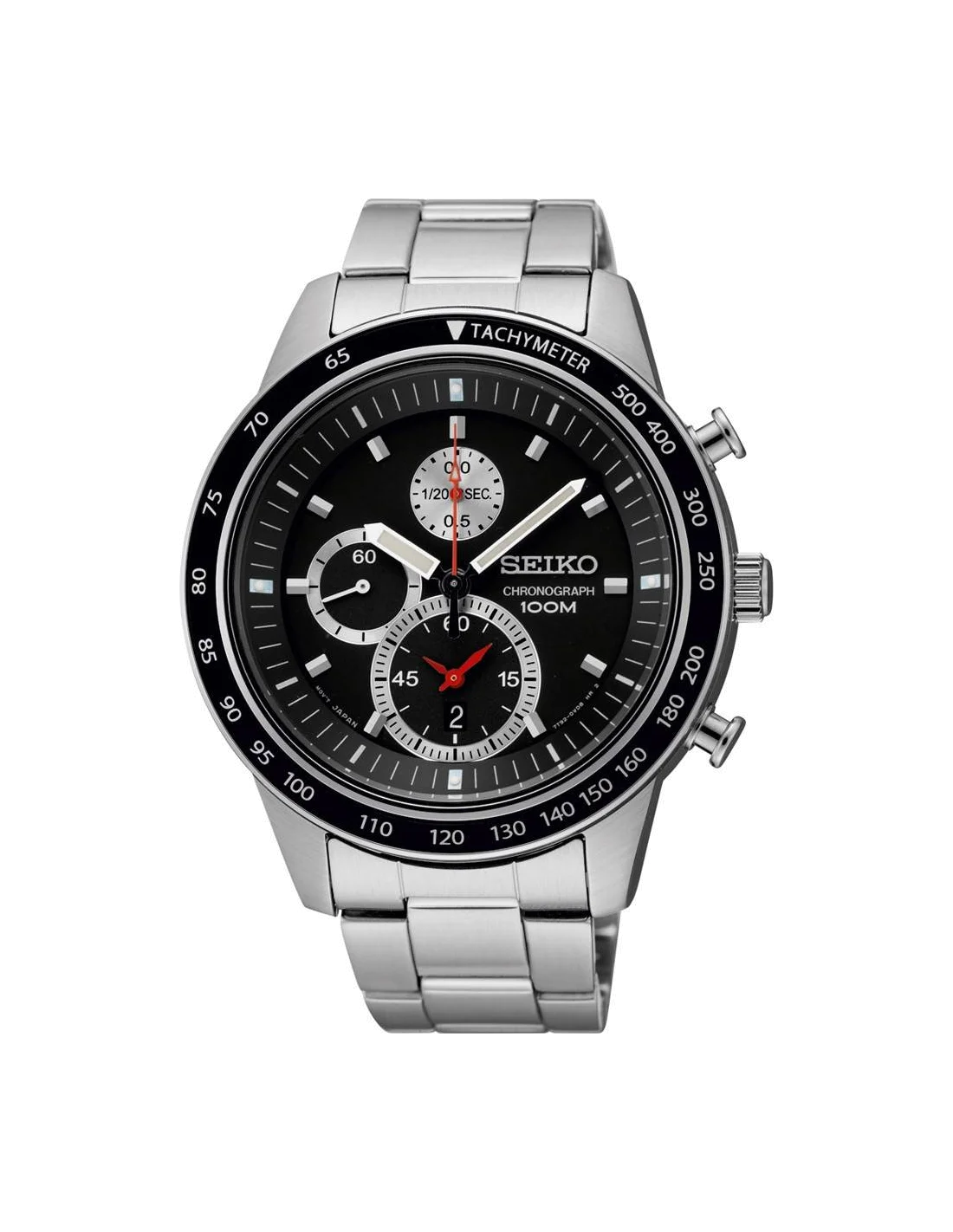 En plus de sa praticité, la Seiko SNDD85P1 arbore un style racé avec son compteur gros format à aiguilles rouges situé sur la partie basse du cadran, et son bracelet massif en acier inoxydable.