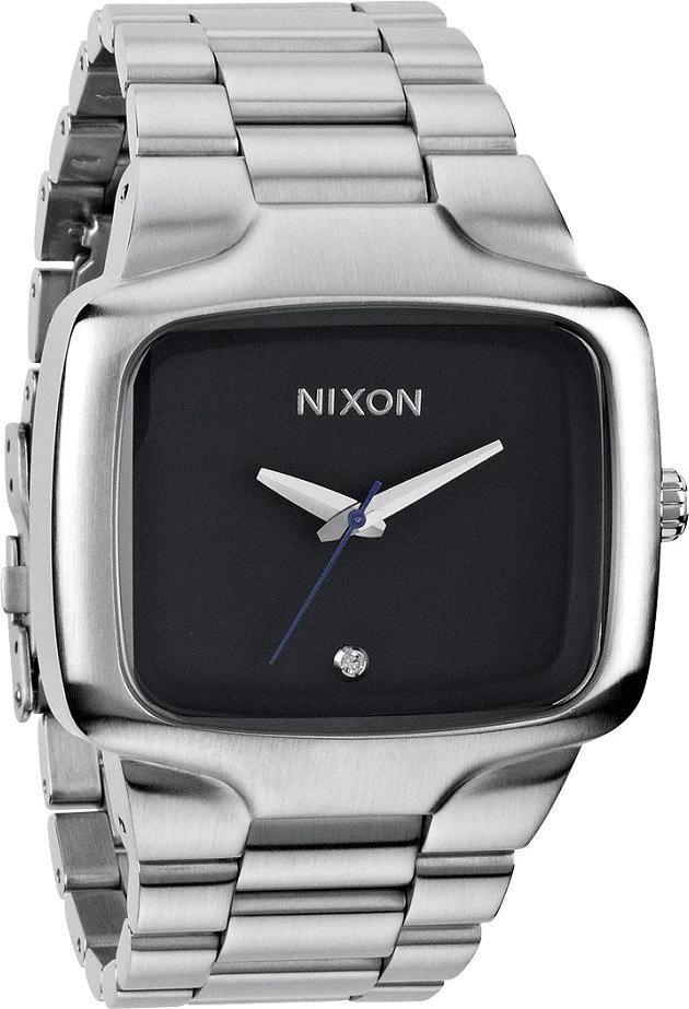 La montre Nixon A487-000 est munie d'un cadran noir qui ressort sur un boîtier et un bracelet en acier argenté.