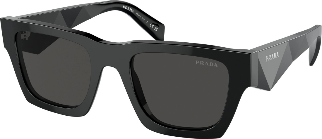 Les lunettes de soleil Prada PR A06S incarnent l’équilibre parfait entre rigueur géométrique et élégance contemporaine. Avec leur monture rectangulaire épaisse en acétate noir brillant, ce modèle se distingue par sa silhouette forte, typique de l’esthétique Prada. Les branches larges et sculptées dans un effet facetté apportent une touche architecturale audacieuse, rehaussée par le logo Prada argenté en lettrage discret.