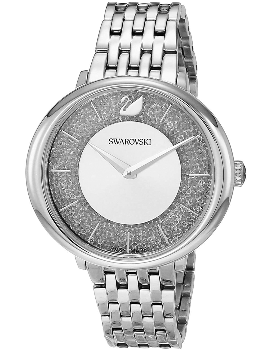 La montre Swarovski 5544583 de la collection Crystalline Chic est une création où la technique horlogère rencontre l'art de la lumière. Son cadran argenté n'est pas une simple surface : il abrite une multitude de micro-cristaux qui captent et transforment la moindre lueur en un scintillement dynamique à chaque mouvement du poignet. Ce jeu de reflets offre une profondeur visuelle unique et une lisibilité parfaite, les aiguilles se détachant avec netteté sur ce fond étincelant.